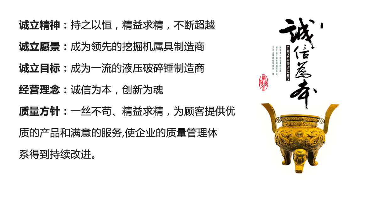 煙臺誠立精密機械有限公司,主要從事液壓破碎錘的研發、生產和銷售。公司積累了豐富的生產破碎錘的經驗。公司旗下擁有誠立,赫利斯,阿特姆,錘博士,韓鈷,韓明等破碎錘品牌,在工程建設中特別是對混凝土拆除和礦山作業優勢更為明顯。公司始終把產品質量視為企業的生命,秉承“11真摯,求實,發展”的企業理念,以不斷為客戶創造價值為追求目標,勵志打造工程機械市場知名品牌,以過硬的質量和服務拓展市場,以品牌求發展,實現與客戶的互利共贏。 煙臺誠立精密機械有限公司愿與您攜手共創美好的未來。